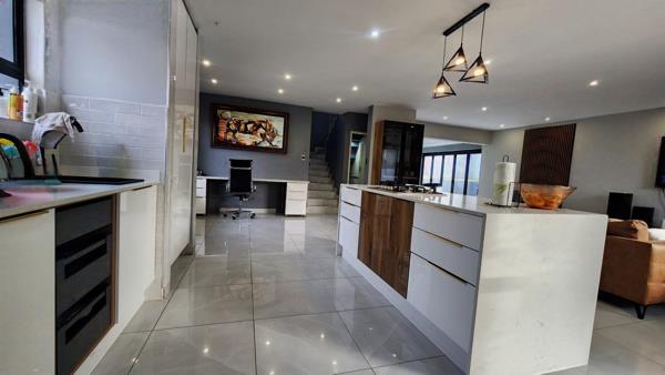 The modern kitchen boasts ample cabinetry, a gas hob, pantry, separate scullery and a striking island with a breakfast nook.