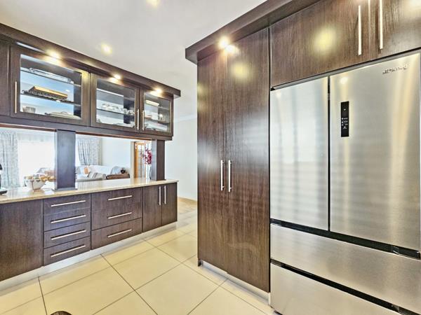The ground floor welcomes you with expansive, sunlit living spaces that seamlessly blend style and functionality. An open-concept lounge and dining area flow effortlessly into a fully enclosed entertainment room, complete with a built-in braai and barperfect for year-round hosting. The elegant kitchen is equipped with an electric stove and extractor fan, ample cabinetry, and space for a double-door fridge, complemented by a practical breakfast nook overlooking the dining space. A separate scullery provides dedicated room for laundry and appliances.
