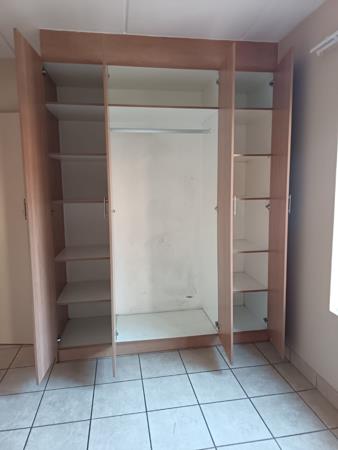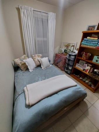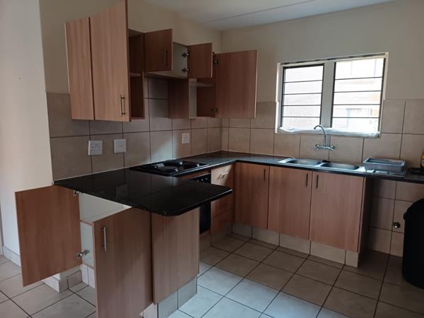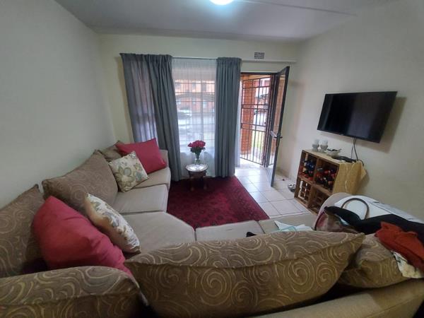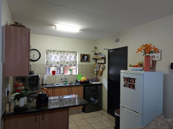 The home features two well-sized bedrooms with built-in cupboards, a neat bathroom, and an open-plan living area that flows seamlessly into the kitchen. With ample counter and cupboard space, the kitchen is designed to make everyday living both practical and enjoyable.
