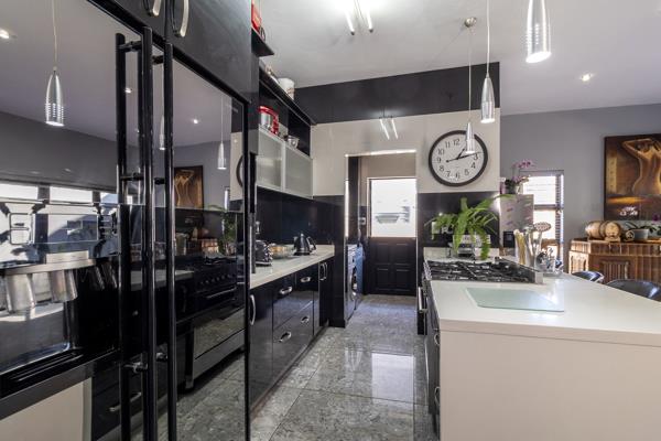 The stylish kitchen is a chefs dream, equipped with a 6-burner gas stove, ample cupboard space, and a separate scullery that accommodates three under-counter appliances.