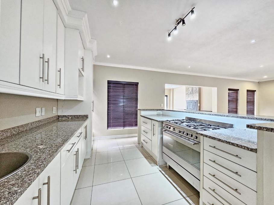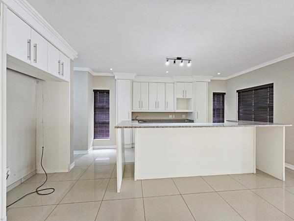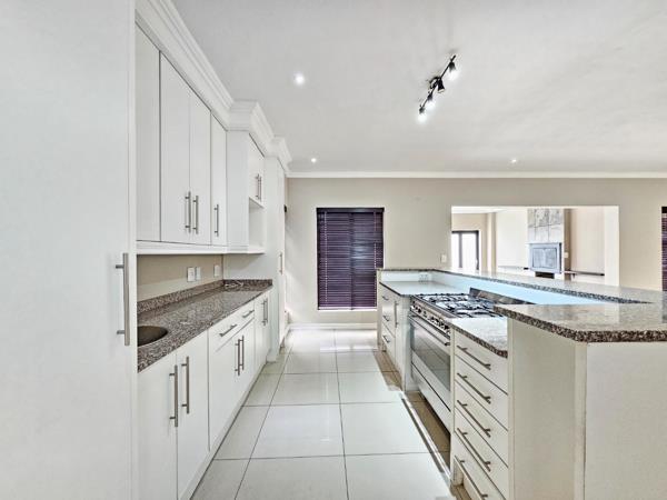 The ground floor opens into light-filled, interconnected living spaces that include a stylish lounge, dining area, and family TV room. Large sliding doors extend the living area onto an enclosed patio fitted with a built-in braai, allowing effortless indoor-outdoor entertaining throughout the year. The contemporary kitchen serves as the heart of the home, featuring a gas stove, ample cabinetry, a separate scullery, and a walk-in pantryideal for anyone who enjoys cooking and hosting.