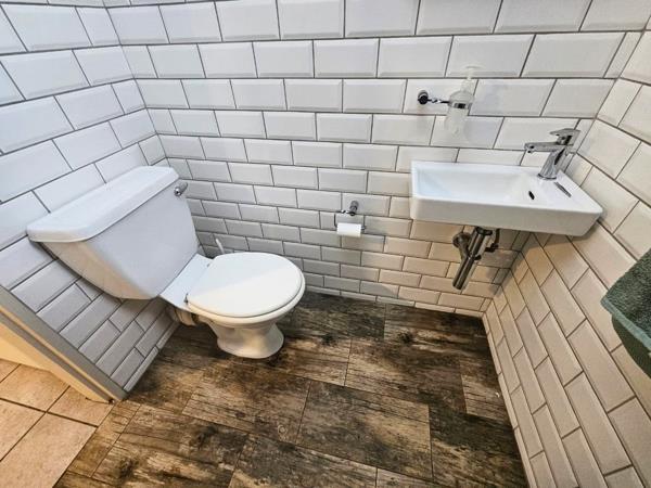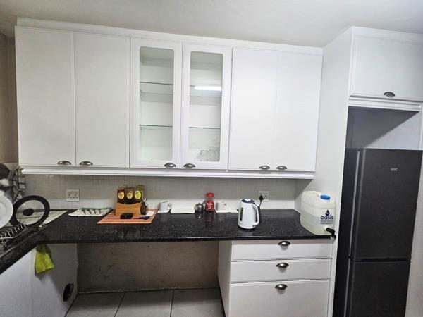Step into a spacious open-plan living and dining area, ideal for both relaxation and entertaining. The neat kitchen features built-in cupboards, space for a washing machine, and a single fridge, making meal preparation effortless.