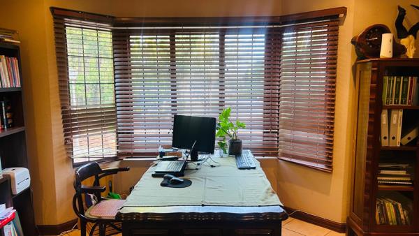 The exterior of the home consists of a stunning covered patio that has triangular skylights that allow for natural sunlight and a built in braai, great for entertaining guests. The patio area has a open view of an fantastic garden that offers tranquility and calmness.