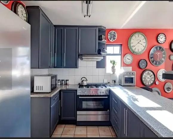 Upon entry, the interior reveals an expansive open-plan design, seamlessly integrating the living, dining, and kitchen areas. The contemporary kitchen is appointed with modern dark grey cabinetry, generous counter space, a functional breakfast bar, and stainless steel appliances. The living areas are characterized by their spaciousness and unique design elements, including accent walls and large glass sliding doors that invite natural light.