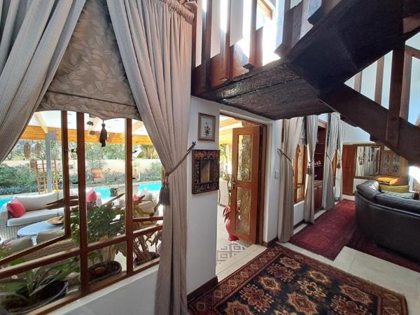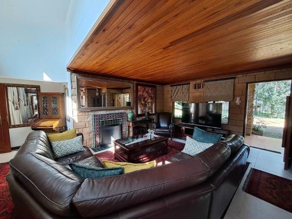 ON SHOW BY APPOINTMENT. The well-manicured garden leads you to the entrance of this elegant home. Neutral tones of the interior living spaces complement the various rooms in the home. The entrance leads into the open plan lounge that has a cosy fireplace. At the back of the lounge a double door swings open to the delightful, extensive patio where you can entertain at your heats delight, overlooking the sparkling pool and the manicured garden. The borehole ensures the garden looks luscious all through the year. To the left you will find the well-planned kitchen that has a separate family living space with a sociable breakfast nook. The spacious kitchen has a gas stove, granite tops, ample cupboard space made of good quality cherry wood and the dining room fits in neatly on the one side. As you go through a door to the one wing of the house, you will find a guest toilet, a very large study, that can also be used as a pyjama lounge, and the two childrens bedrooms that share a bathroom with a large shower. The second wing of the house hosts the luxurious, sunny master suite with a stylish en-suite bathroom with a beautiful bath and walk- in shower. The master bedroom has a door opening to the pool and entertainment area completing the ground floor.