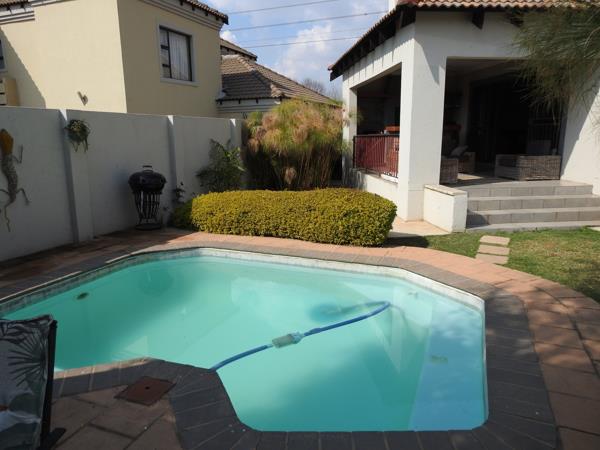 Upon entry, youre welcomed into expansive open-plan living areas that seamlessly flow to a covered patio, complete with a built-in braai. The patio overlooks a sparkling pool and a generous, landscaped garden featuring a boma area and undercover outdoor storage.