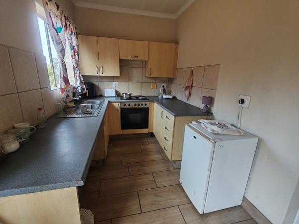 This compact 1-bedroom apartment is situated within a secure estate in Wapadrand, Pretoria. The functional layout includes a well-appointed kitchen featuring light wood cabinetry, dark gray countertops, and practical tiled splashbacks. Equipped with a built-in oven and hob, the kitchen offers ample storage and countertop space. Adjacent to this, the living area presents neutral walls and modern wood-look tiled flooring, creating a versatile base for personalisation. Natural light streams through the windows, enhancing the inviting atmosphere.