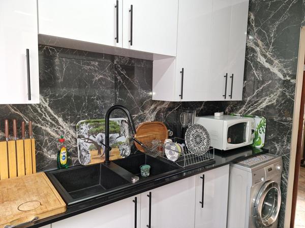 Newly renovated kitchen with modern features, ample cupboards and space for all appliances. Washing machine and fridge included.