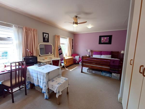 Sliding door opens to covered patio adjustable louvre deck in private garden - access to borehole for garden usage.