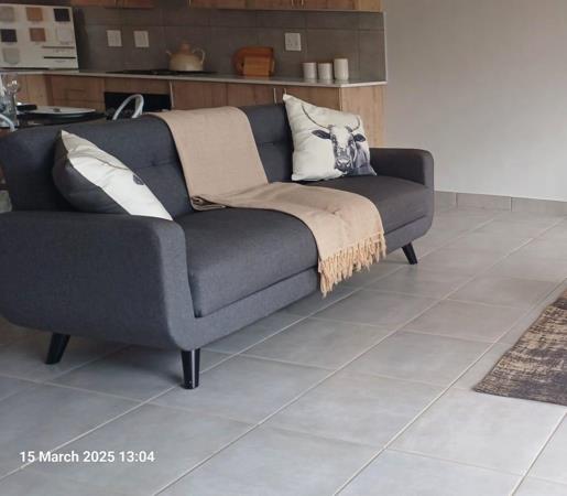 Spacious tiled dining room and lounge area with a TV point and sliding door leading out into your own enclosed private large enclosed garden
