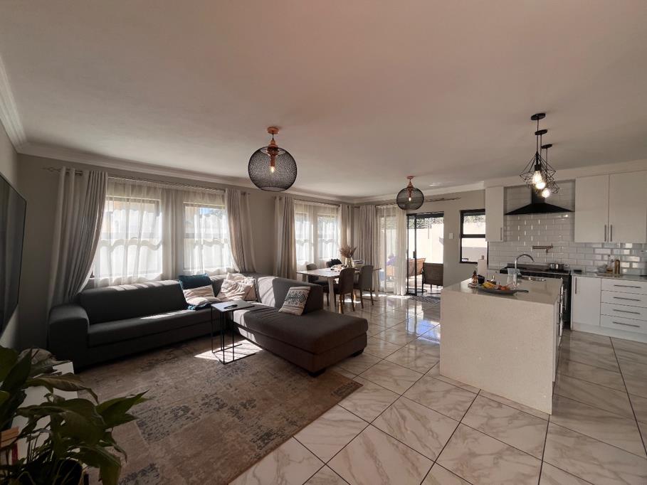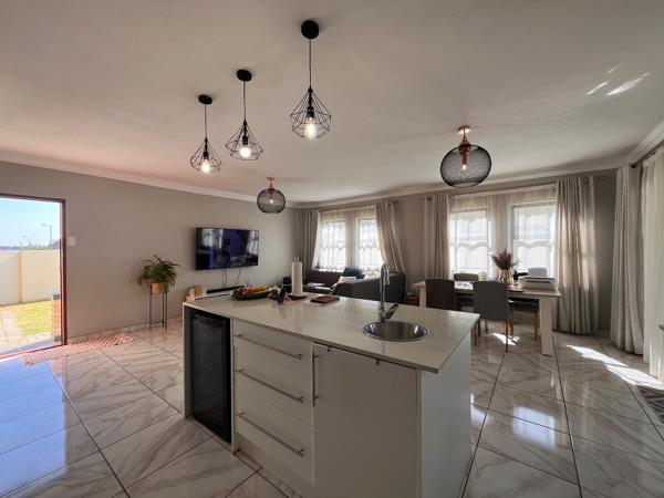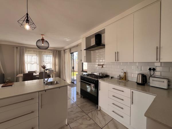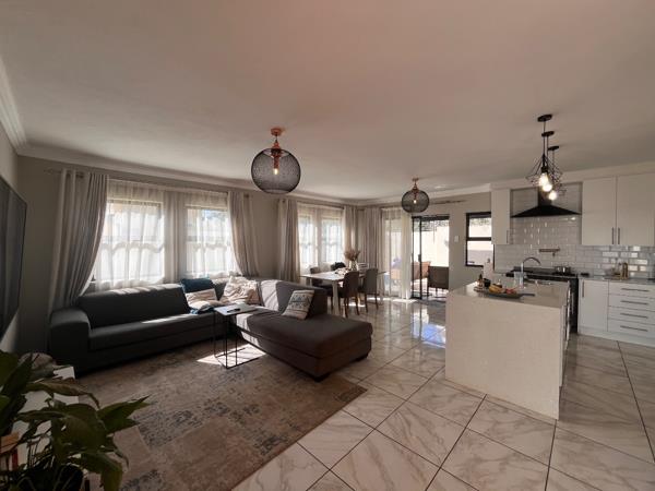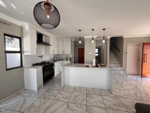The ground floor is dedicated to seamless open-plan living, perfect for both daily life and effortless entertaining. The heart of the home is the beautifully laid out kitchen. This culinary dream is equipped with a gas stove and elegant granite countertops, complemented by a dedicated scullery for added convenience. The inviting culinary space flows effortlessly into the bright north facing lounge and dining room, ensuring ample natural light bathes the interiors throughout the day. From the dining room step out onto the tranquil patio, which provides a lovely vantage point over the expansive wrap-around garden offering plenty of outdoor space for relaxation, children''s play, or even establishing your own personal oasis.