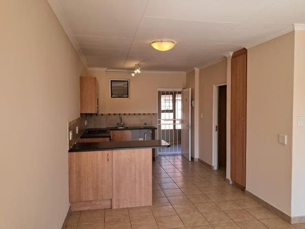 Walk into a bright and airy space with excellent finishes that create a warm and inviting environment. The open-plan layout seamlessly connects the living area and a stylish kitchen with ample cupboards, with space for a washing machine and a fridge.