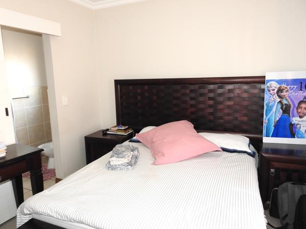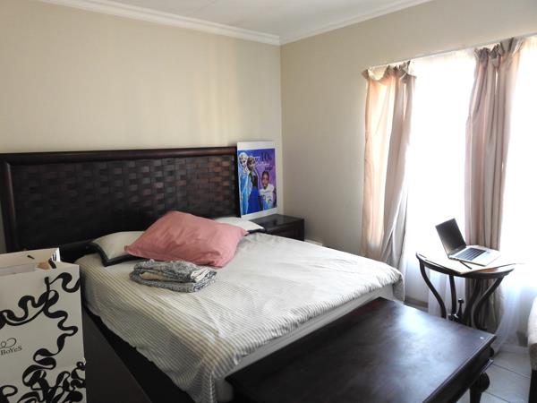 The townhouse offers three spacious bedrooms, each with built-in cupboards and tiled floors throughout. The main bedroom includes a full en-suite bathroom and ample cupboard space.