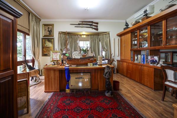 Just off the kitchen, the formal dining room with a built-in Rosewood bar is perfect for hosting elegant dinner parties, while a cozy enclosed patio with built-in-braai offers a quiet retreat.