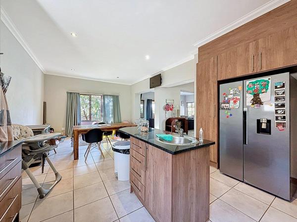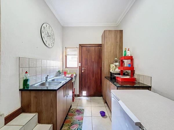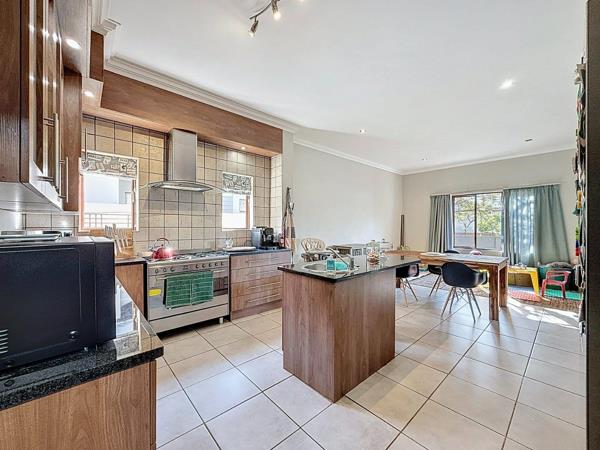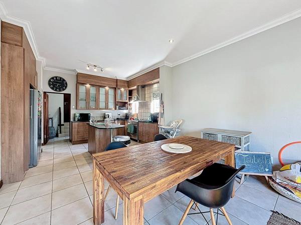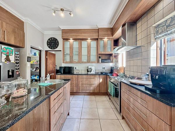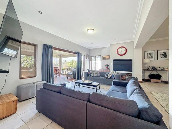 The ground floor offers a generous open-plan lounge and dining area flowing seamlessly onto the patio and lush garden. The well-appointed kitchen features granite countertops, ample cupboards, a pantry, and a separate scullery. A bright guest bedroom with a modern bathroom adds flexibility, while a covered patio with retractable awnings, an elevated wooden deck, and a dedicated bomabraai area create the ultimate outdoor gathering space. Additional conveniences include a double garage with direct home access, a staff room, and two storerooms.