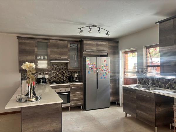 Enjoy open-plan living with a spacious dining and lounge area that flows seamlessly into a modern kitchen featuring a gas stove and space for two appliances. The built-in braai is perfect for entertaining, while the guest toilet and storage area add convenience. The double automated garage includes generator fittings, extra cupboards, and additional space for a washing machine and tumble dryer.
