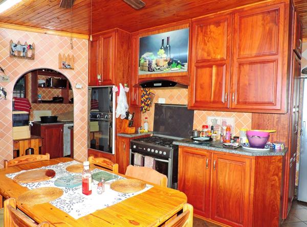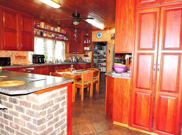 The well designed kitchen features solid Rose Wood cupboards, a breakfast nook, a sit-in dining room, a separate scullery, laundry and pantry.