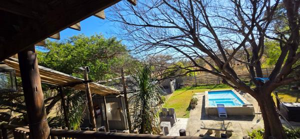 The main, wooden, double storey house offers four bedrooms, three bathrooms (two en-suite), a large open-plan living/dining/kitchen area, with a separate scullery. Two of the bedrooms open up on a large patio covering the full width of the house, with beautiful views over the entertainment area, pool and the Bushveld beyond. The lower front porch also spans the full width of the house.