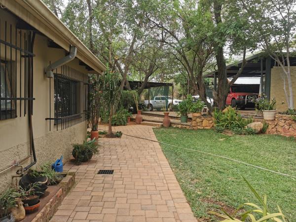 MAIN HOUSE: This rock-clad house is spacious and designed for entertaining offering 4 large bedrooms with built-in cupboards, a office, 3 bathrooms, open plan lounge, dining room and sleeper-wood bar area that flow onto an enclosed front patio. TV room for family relaxation also with enclosed patio, kitchen with pantry and laundry walking out into backyard with braai facilities. Three covered parkings, wendy-house for staff accommodation with enclosed bathroom, very neat workshop. Eskom and solar electricity (12k inverter and four 5kw batteries), 5 JoJo 3000l water tanks.