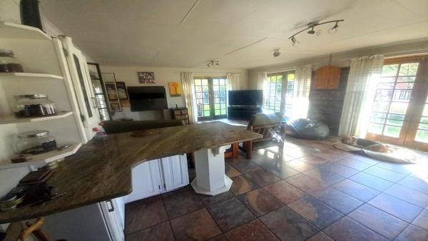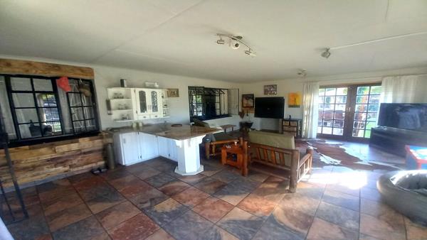 The property offers a very large covered patio with built-in braai at the front door leading to the spacious Lounge with fireplace set in an open plan with the Dining room that can fit an 8-seater table.