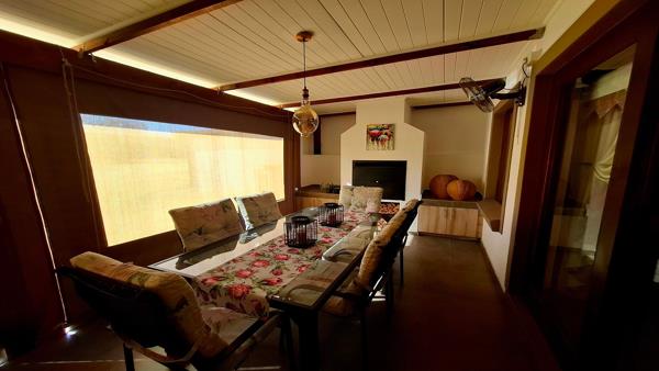 The Lounge leads out to a covered patio that offers another lounge and a Dining room with a fire place that is round off with roll down canvas curtains overlooking the Golf course.