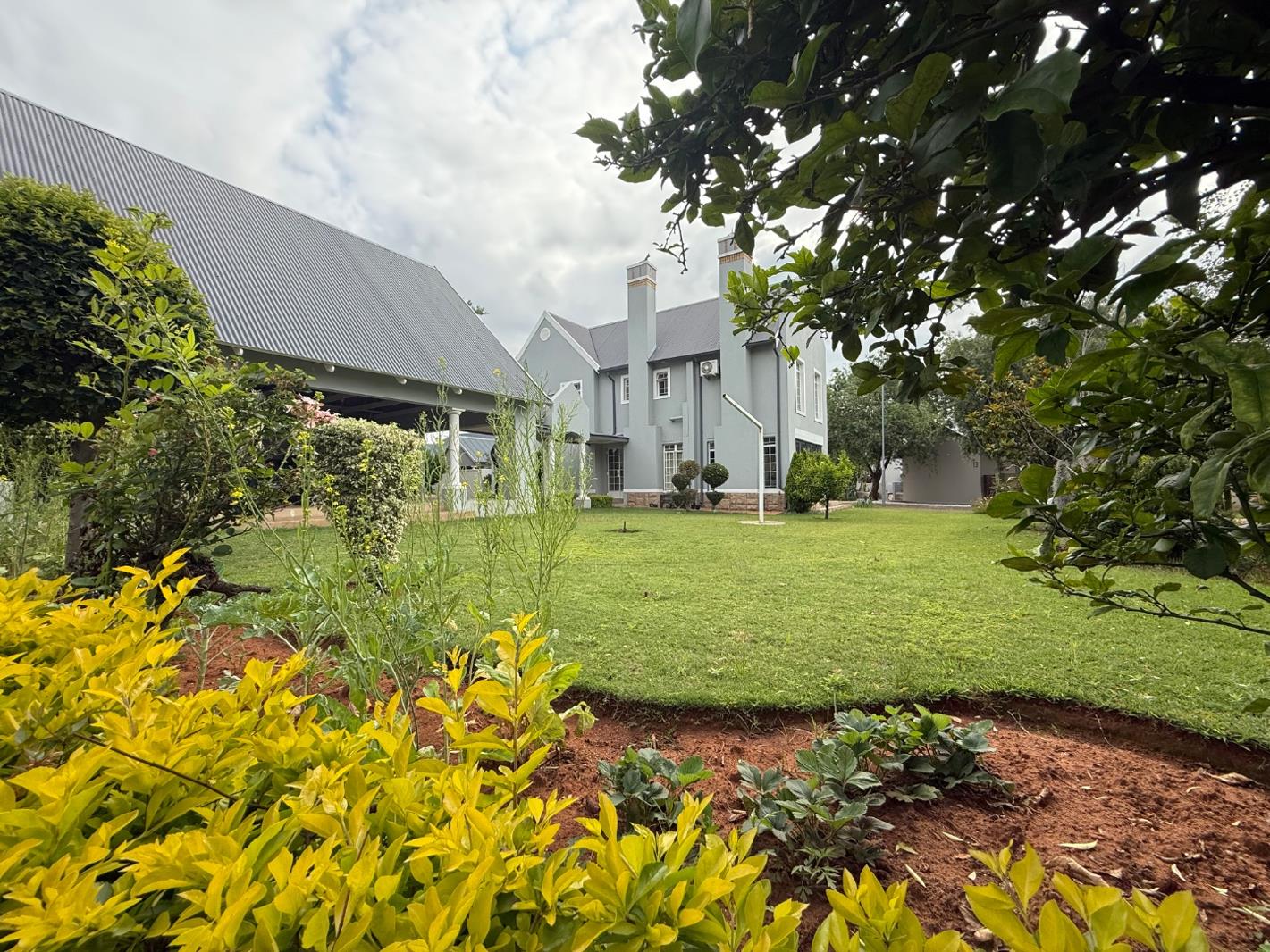 Nestled within a prestigious golf and security estate in Cullinan, this substantial family home offers an exceptional lifestyle in a tranquil South African setting. Enjoy the peace of mind that comes with 24-hour security and access to a club house and golf course. The property boasts impressive kerb appeal, featuring a grand, light gray multi-story house with classic architectural details and a meticulously maintained lawn and diverse garden beds. An expansive secondary structure with a covered walkway provides significant versatile space, complementing the generous 931 sqm erf.