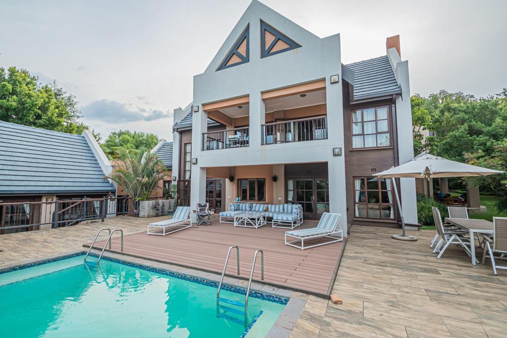 Expansive Main Residence: Multiple reception rooms, a social bar, and outdoor braai area leading to a sparkling swimming pool.