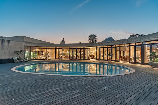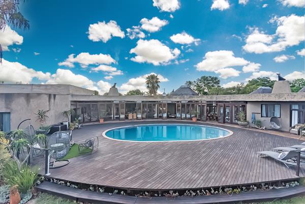 This luxurious single level home is designed in a way that it caters for a big family home, but a family can still stay there when the children are grown-ups and use the flats for their grannies or married children, because the main house comprising of 4 bedrooms al en-suite, have an intimate feeling as if you are living in a normal 4 bedroom house. But the moment you are moving to the expansive enclosed patios you are entering a wonderworld of entertainment: braai area, heated pool, jacuzzi, gym with tan room and bathroom, squash court, cinema theatre, boardroom.