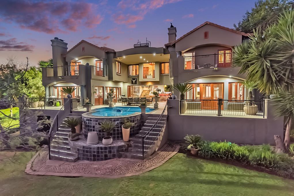 This stunning home features 5 bedrooms all en-suite, 2 staff quarters, 3 living areas, newly renovated modern open-plan kitchen, 4 garages, a stylish bar and wine cellar leading out to a large patio with built-in braai overlooking a sparkling swimming pool and designers garden with manicured lawns and panoramic views, also a cricket pitch for the sport lovers as well as a beautiful duck-pond.