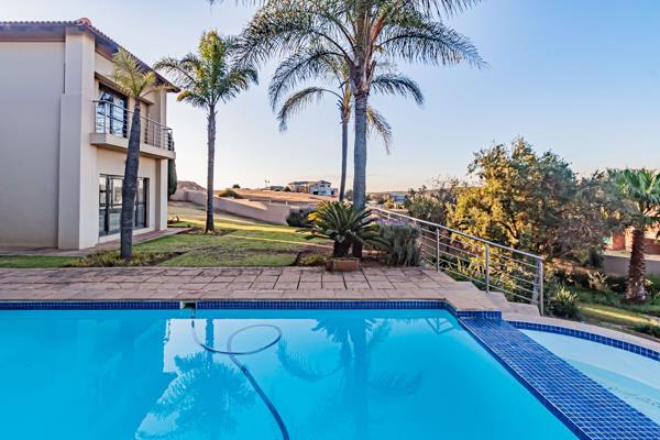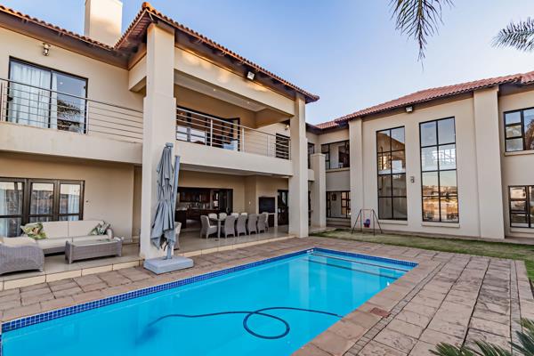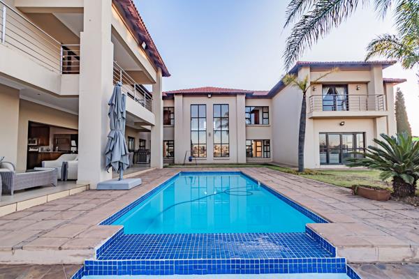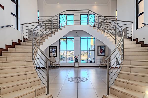 A breathtaking double grand staircase welcomes you to the top floor. The ground floor hosts a formal lounge, open-plan dining room, and main lounge with a fireplace, all seamlessly connected to the covered outside pool area featuring a built-in braai.