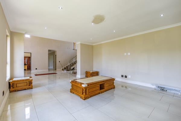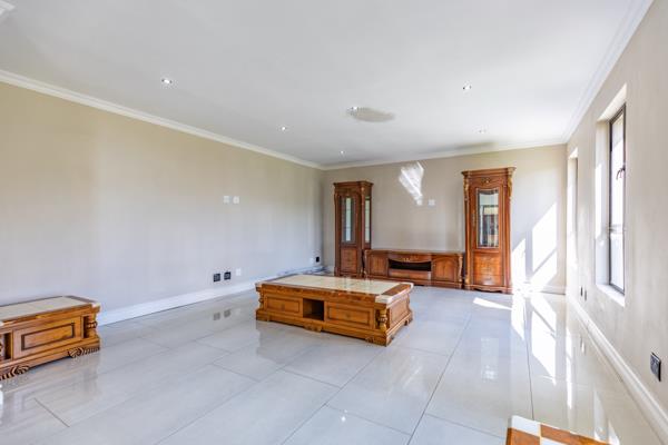 The property also features a dedicated cinema room, a gourmet kitchen with scullery and pantry, an iron room, and two staff quarters with a kitchen and full bathroom. The luxurious upper level includes four beautifully sized bedrooms, each with an en-suite shower, and a main bedroom with a lavish walk-in closet and full bathroom. Additional features include a linen room, cozy pajama lounge, and five garages providing ample space for vehicles and storage needs.