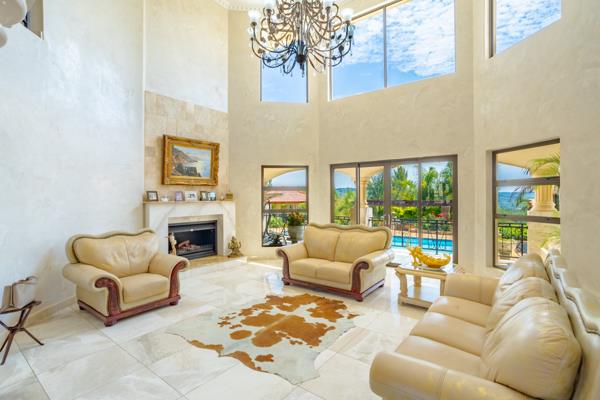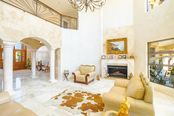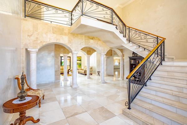 From the moment you enter the majestic foyer through a huge 6.5m oak and glass door, you are welcomed by a stunning crystal chandelier that can be automatically adjusted to create the perfect ambiance. The home exudes sophistication with marble flooring and Venetian plaster wall finishes, made from a luxurious mixture of plaster, marble dust, and water. Expansive stack doors seamlessly connect the indoors to the scenic balconies and patios, framing breathtaking views over Pretoria East.