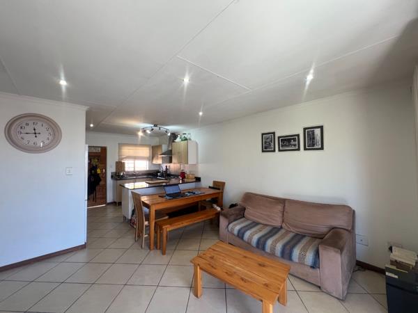 The home boasts a spacious open-plan living and dining area, flowing seamlessly into a modern, well-equipped kitchen with ample cupboard space and a breakfast counter. The three bedrooms are generously sized, with built-in cupboards, while the main bedroom includes an en-suite bathroom for added comfort. A second bathroom serves the additional bedrooms, making the layout both practical and family-friendly. Outdoors, youll find a private garden perfect for entertaining, relaxing, or simply enjoying the fresh air. The unit also includes a double garage and visitor parking.