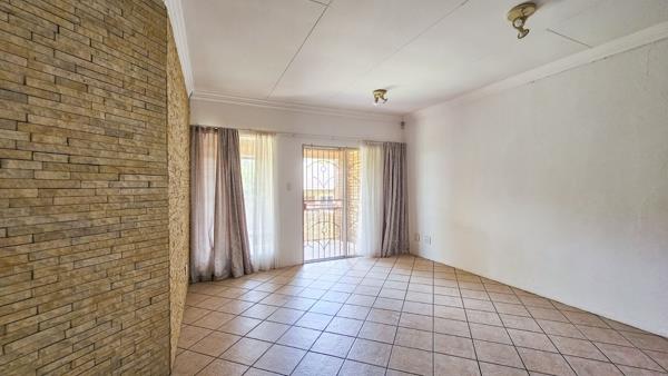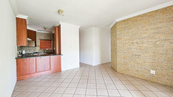 The tiled lounge opens onto an undercover patio overlooking the private garden, creating an inviting indoor-outdoor lifestyle. The modern kitchen includes space for a single-door fridge and one under-counter appliance.