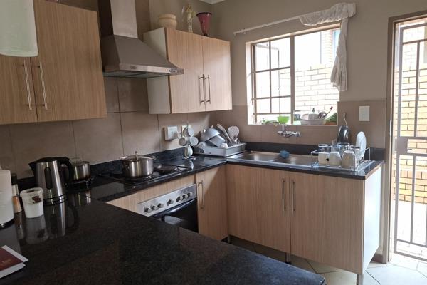 This neat townhouse offers a modern kitchen with granite tops, space for three electrical appliances, an extractor fan above the stove, and room for a double-door fridgefreezer. Enjoy a comfortable lounge and dining area, plus three spacious bedrooms. Both bathrooms feature baths, showers, toilets, and basins, with the main bedroom boasting an en-suite.