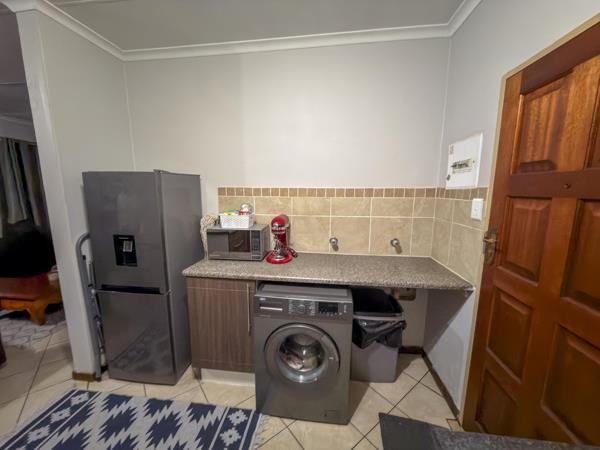 Inside, the home features an elegant open-plan kitchen fitted with built-in cupboards, melamine countertops, a breakfast nook, and space for two appliances plus a fridge. The unit is fully tiled throughout, with both bedrooms equipped with built-in wardrobes. A full bathroomcomplete with bath, shower, basin, and toiletserves the home.