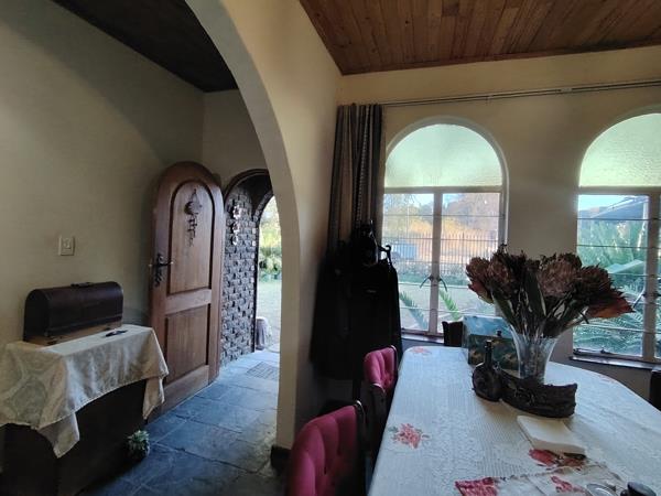 Inside, the inviting entrance hall leads to a massive lounge on one side and a dining room that easily accommodates an 8-seater table on the other, both finished with charming slate floors. The well-equipped kitchen boasts ample built-in cupboards, melamine countertops, an electric hob, eye-level oven, a separate pantry, and a scullery. The home further offers 4 spacious bedrooms and 2.5 bathrooms. The main bedroom includes a private en-suite bathroom and a dressing area for added convenience. A separate laundry area completes the practical layout.