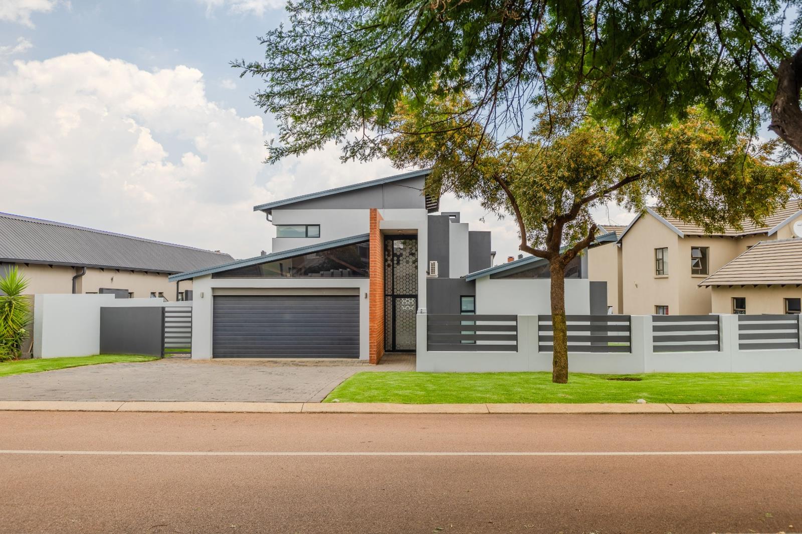 Discover this striking contemporary residence nestled within the prestigious The Hills Game Reserve Estate in Pretoria. Boasting a distinctive architectural design with sleek lines and a sophisticated grey and white palette, this home immediately impresses. A neatly paved driveway leads to a double garage, complementing the well-maintained exterior and secure perimeter.