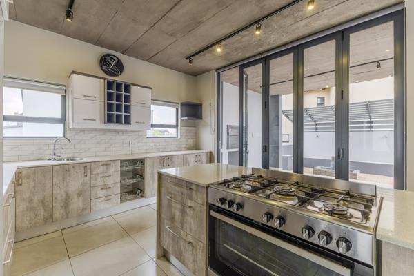 Step inside to an expansive 330 sqm of modern living space, where an industrial-chic aesthetic defines the open-plan layout. Exposed concrete ceilings with track lighting, light tiled flooring, and an accent brick wall create a unique ambiance. The seamless flow connects the spacious lounge and dining areas, perfect for both intimate gatherings and larger entertaining, to a contemporary kitchen. This culinary space features a central island with a gas range, sleek white cabinetry, a dedicated pantry, and an integrated wine rack, blending functionality with sophisticated design. Large windows and bi-fold glass doors flood the space with natural light and offer a seamless connection to the outdoors.
