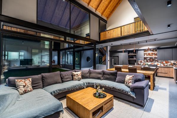 Upstairs, the home offers four additional bedrooms, including a spacious main suite with walk-in wardrobe and full en-suite bathroom. The remaining bedrooms are connected by a central pyjama lounge with views over the pool and garden. The upper level includes characterful features such as exposed wooden ceilings and barn-style doors on the childrens bedrooms, enhancing the warm, family-friendly feel of the home. A large feature window at the end of the hallway offers sweeping views of the game reserve and a perfect spot for quiet reflection.