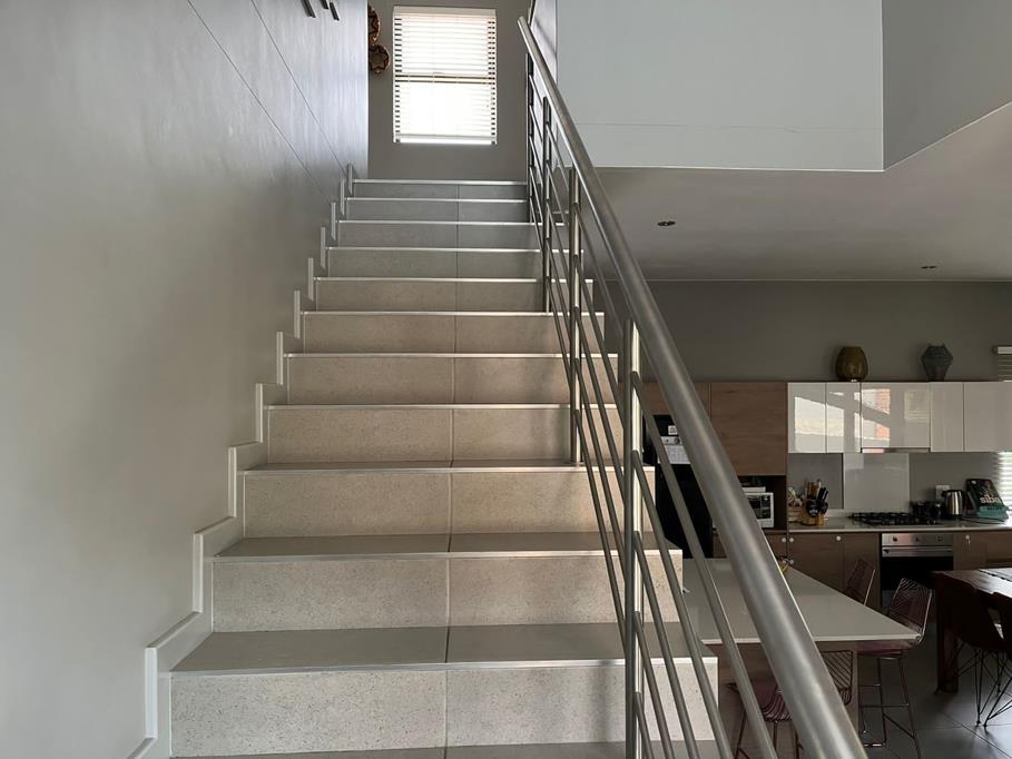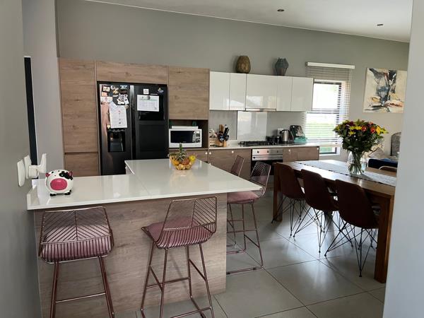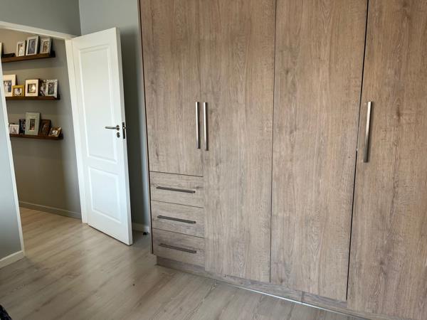 Modern and attractive open plan living and dining area with an aircon. Relax on a covered patio with a built-in braai. Spacious 3 bedrooms with built-in cupboards, 2 full bathrooms of which the main is en-suite plus a guest toilet. The kitchen offers caesar stone counter tops and a SMEG oven, gas hob & extractor fan. You will appreciate the porcelain floor tiles in the living areas and double garage. The unit comprises has a solar system geyser,6 metre washing line, artificial lawn and neat landscaping double automated garage with fitted blinds and private garden.