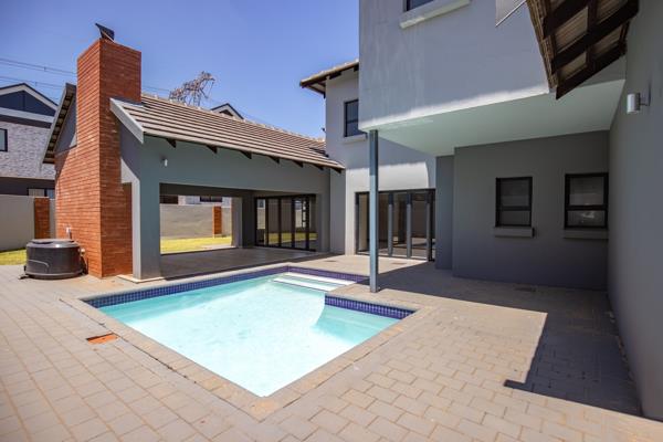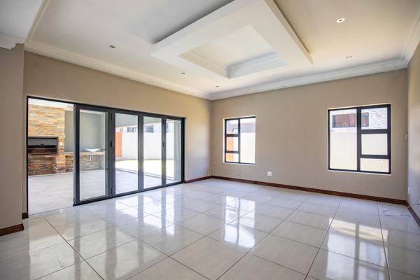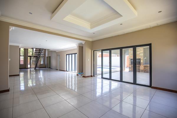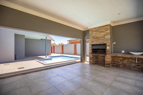 Relaxed open plan living. Spacious family room and dining room area. This opens up via stack doors onto the patio with a built-in braai, giving you that open air feeling. Enjoy cooling down, having fun in the sun in and around the sparkling pool.