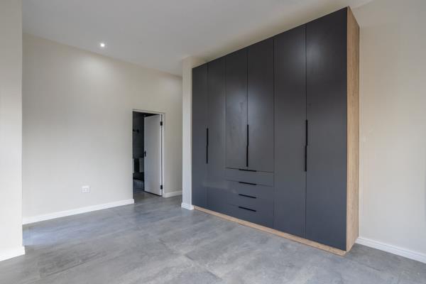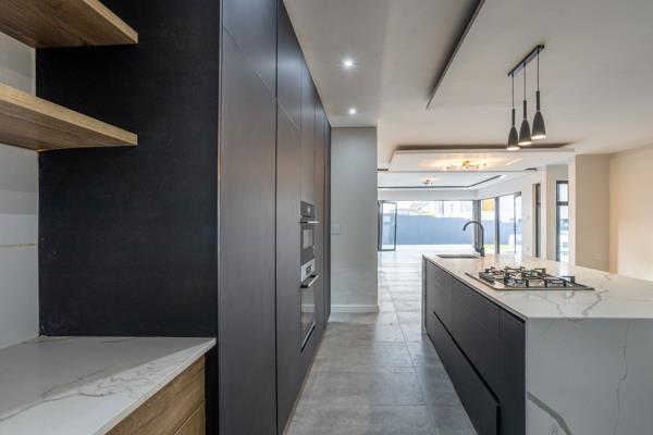 As you enter the home, the heart of the home is the open-plan kitchen, designed to impress with a stunning waterfall island, a gas hob, eye-level microwave oven, and oven, all complemented by top-tier finishes. The kitchen also offers ample space for integrated fridges (fridges not supplied). Adjacent to the kitchen is a lovely big scullery and staff quarters, ensuring practicality and functionality.
