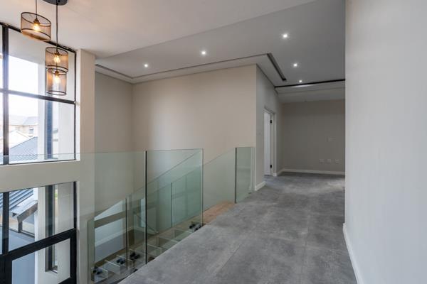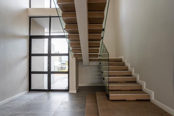 Beautiful glass balustrading along the staircase and custom-built cupboards throughout the home enhance the sleek, modern aesthetic.