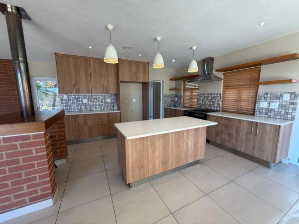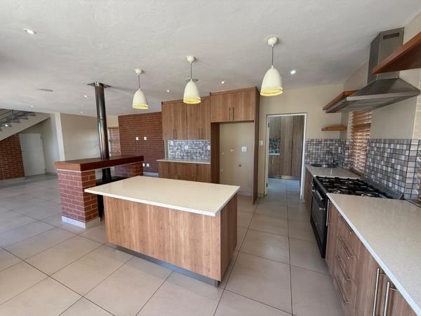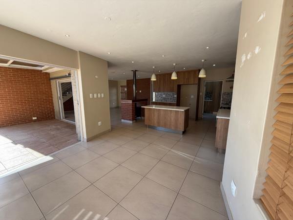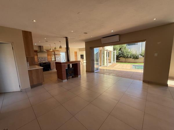 The kitchen is the heart of the homecomplete with a gas hob, separate scullery, and a cosy fireplace that warms both the kitchen and adjacent lounge. The living and dining spaces flow out through stack doors onto a covered patio, overlooking a beautifully landscaped garden and sparkling pool. An indoor entertainment area with a built-in braai makes hosting guests a breeze, while the private en-suite guest bedroom downstairs adds flexibility and comfort.