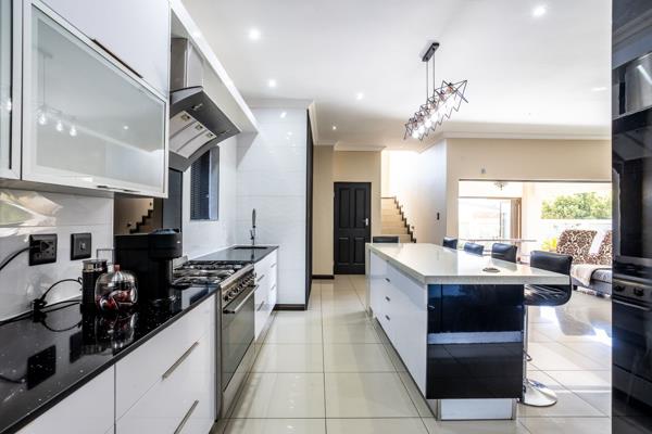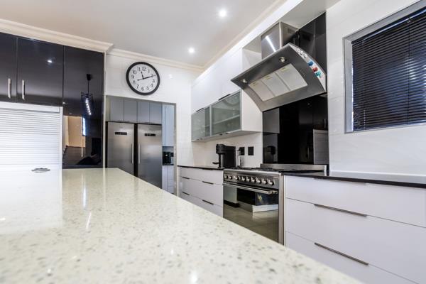 The home opens into a warm and inviting loungeTV room, featuring a beautiful built-in fireplace perfect for cosy evenings with family or entertaining guests. The open-plan dining area connects effortlessly to the modern front kitchen, complete with a stylish coffee station cleverly concealed behind a pull-down aluminium door. A fully-equipped chefs kitchen at the back, along with a separate scullery and laundry, ensures a streamlined cooking and living experience.