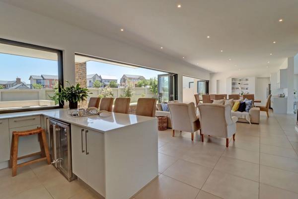 At the heart of the home lies a beautifully integrated open-plan living space. The designer kitchen, elegant dining area, expansive lounge with a feature gas fireplace form a cohesive and inviting hub. Stacking glass doors open this space entirely to a generous covered patio, thoughtfully designed for entertainingwith a built-in braai, ample prep space, storage, and distinct areas for dining and lounging. From here, the landscaped garden unfolds to reveal a boma, sparkling pool, and private putting greenperfect for relaxed family living and unforgettable gatherings.