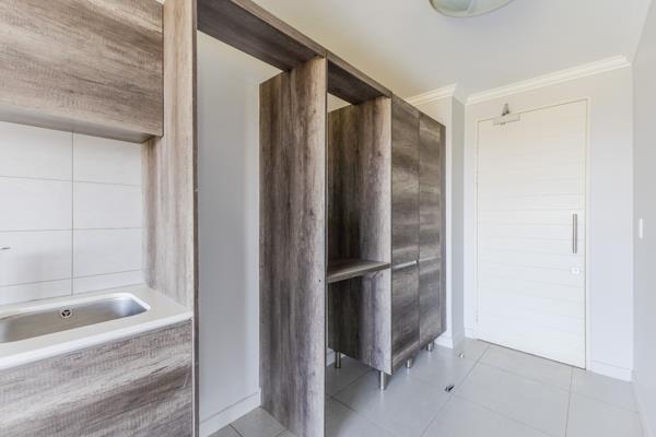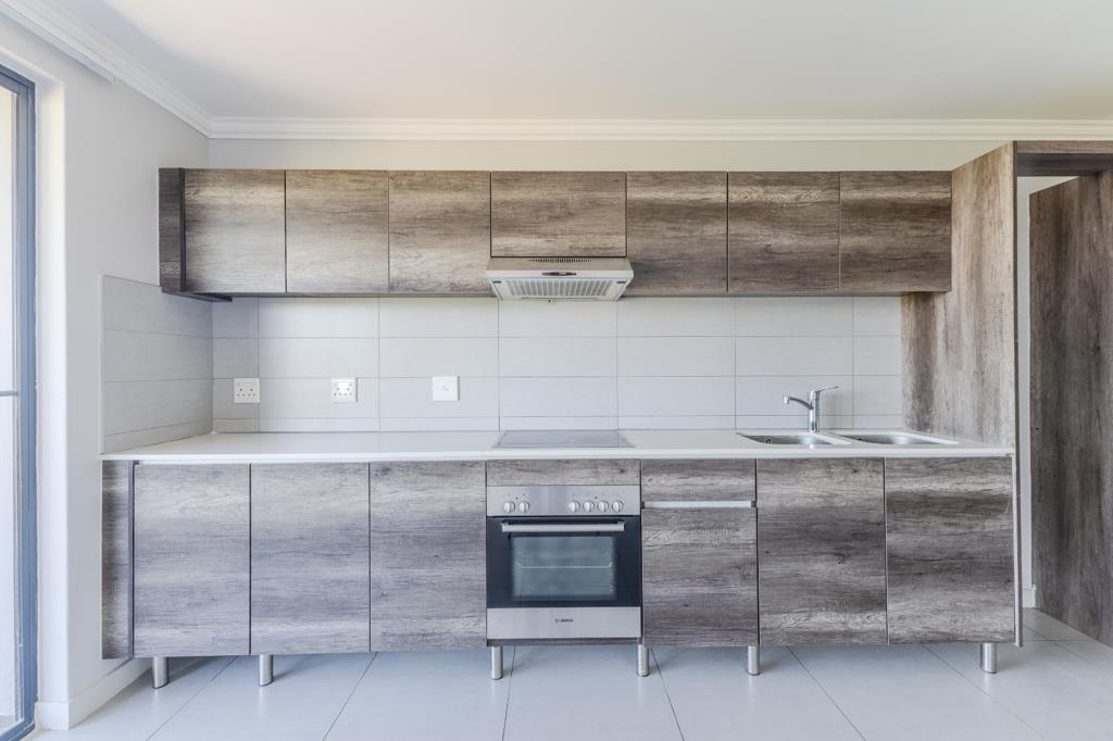 Experience contemporary living in this stylish 65 sqm, 1-bedroom apartment within The Hills Game Reserve Estate, Pretoria. The interior features a modern design with a neutral palette, including light grey walls and clean tiled flooring throughout. An open-plan lounge and dining area create a spacious atmosphere, flowing seamlessly. The well-appointed kitchen boasts sleek grey wood-grain cabinetry, white countertops, and integrated modern appliances like a Bosch oven, electric hob, and extractor fan, alongside a convenient double stainless steel sink. Large sliding glass doors ensure ample natural light and provide access to private balconies, ideal for enjoying scenic views.