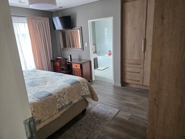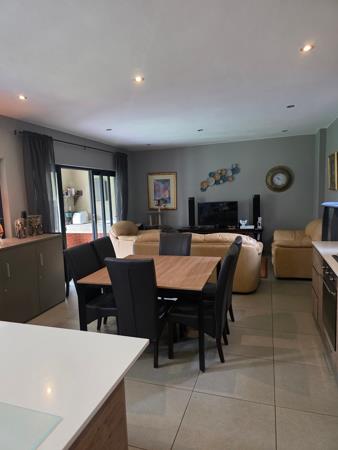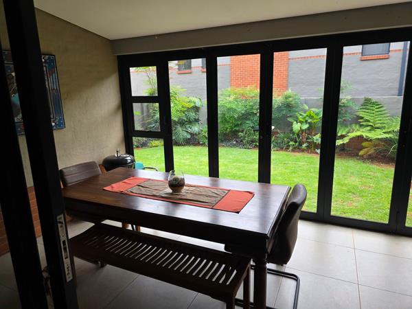 The large open-plan living and dining area flows seamlessly into a gourmet kitchen featuring ultra-modern finishes. The living space opens onto a covered patio with a built-in braai and a private walled gardenperfect for entertaining.