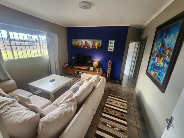 A large open-plan lounge, dining room, and kitchen. One huge bedroom with full en-suite bathroom equipped with a gas geyser.